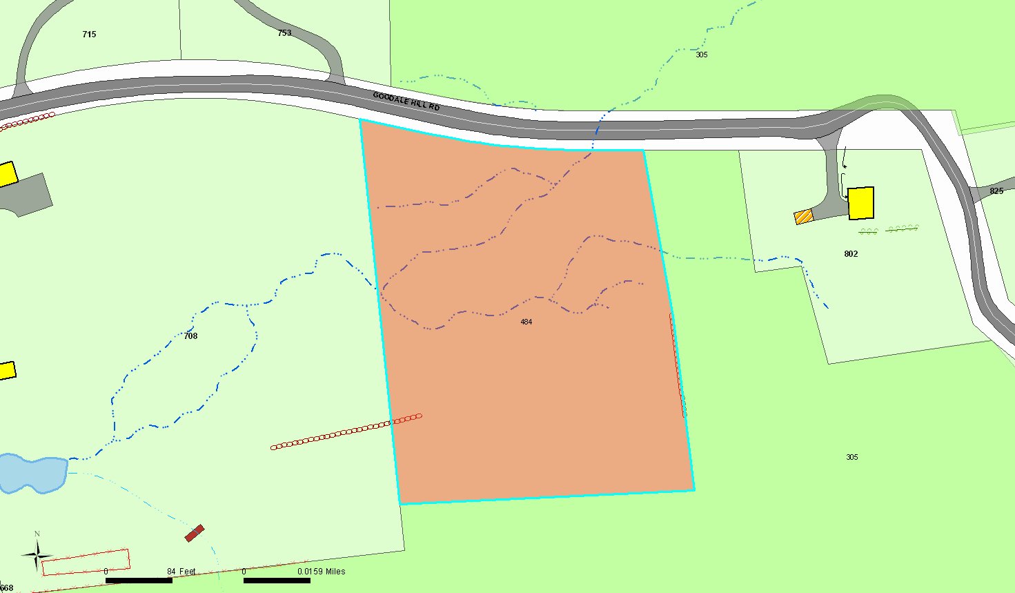 | Description: This small parcel lies on the south side of Goodale Hill Road 100 yards west of Alligator Rock. It adjoins Meshomasic State Forest east and south and across the road to the north. It is crossed by two intermittent streams which feed Wintergreen Brook - a tributary to Roaring Brook. |